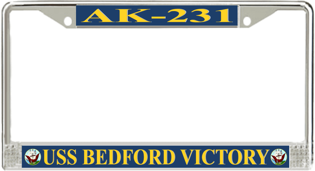 USS Bedford Victory AK-231 License Plate FrameThis USS Bedford Victory AK-231 License Plate Frame is proudly made in the USA at our facilities in Scottsboro, Alabama. Each of our MilitaryBest U.S. Navy Frames feature top and bottom Poly Coated Aluminum strips that are printed using sublimation which gives these quality automobile military frames a beautiful high gloss finish.