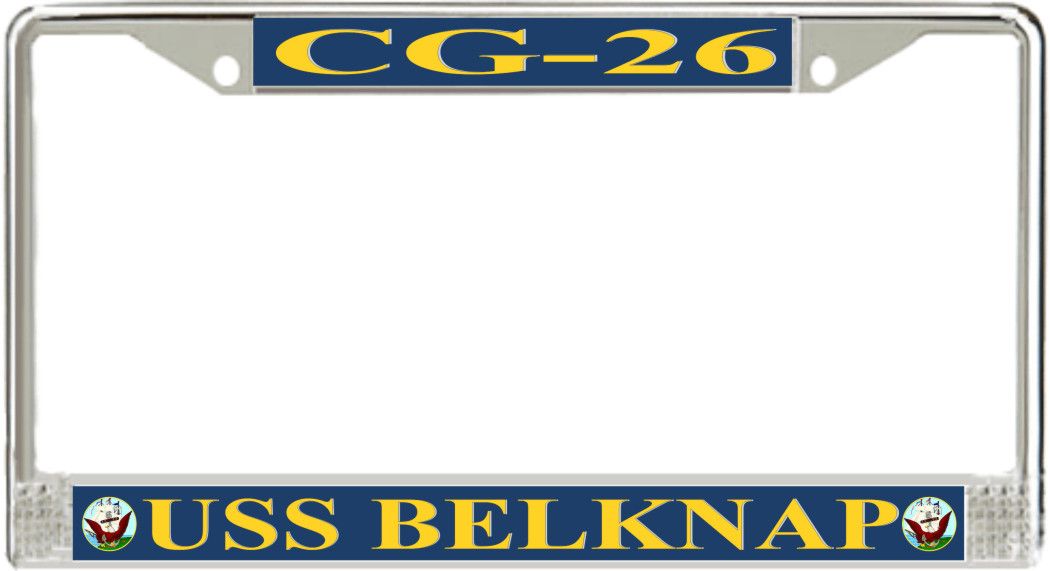 USS Belknap CG-26 License Plate FrameThis USS Belknap CG-26 License Plate Frame is proudly made in the USA at our facilities in Scottsboro, Alabama. Each of our MilitaryBest U.S. Navy Frames feature top and bottom Poly Coated Aluminum strips that are printed using sublimation which gives these quality automobile military frames a beautiful high gloss finish.