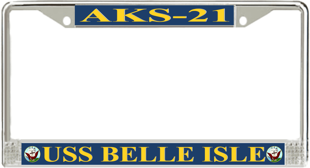 USS Belle Isle AKS-21 License Plate FrameThis USS Belle Isle AKS-21 License Plate Frame is proudly made in the USA at our facilities in Scottsboro, Alabama. Each of our MilitaryBest U.S. Navy Frames feature top and bottom Poly Coated Aluminum strips that are printed using sublimation which gives these quality automobile military frames a beautiful high gloss finish.