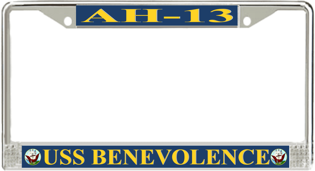 USS Benevolence AH-13 License Plate FrameThis USS Benevolence AH-13 License Plate Frame is proudly made in the USA at our facilities in Scottsboro, Alabama. Each of our MilitaryBest U.S. Navy Frames feature top and bottom Poly Coated Aluminum strips that are printed using sublimation which gives these quality automobile military frames a beautiful high gloss finish.