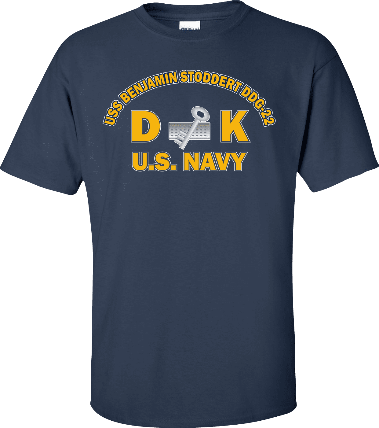 MilitaryBest is proud to offer this USS BENJAMIN STODDERT DDG-22 Rate DK Disbursing Clerk T-Shirt. This shirt is available as a 100% cotton t-shirt or a 100% polyester men’s or women’s moisture wicking t-shirt. Each shirt is proudly printed in the USA.