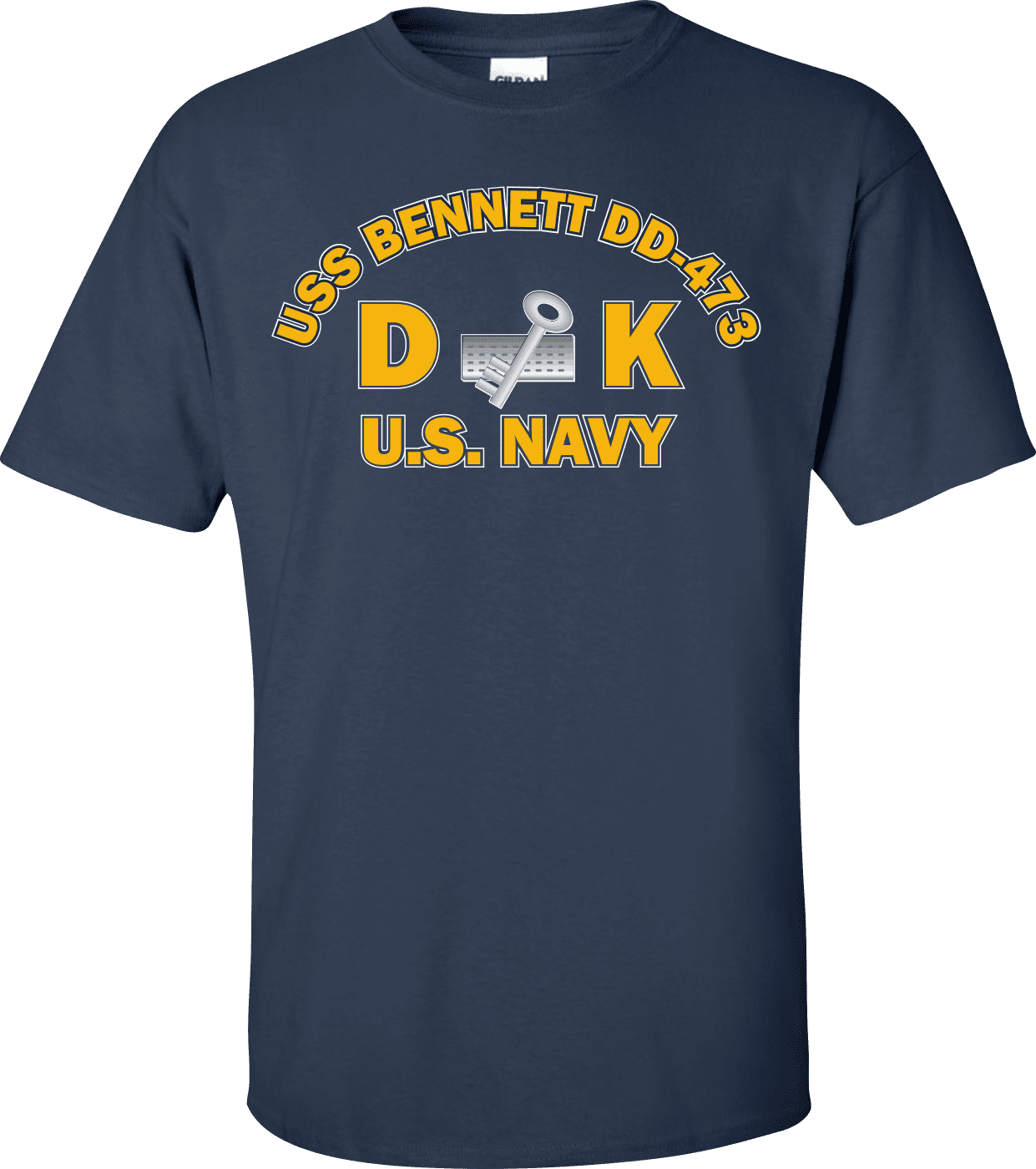 MilitaryBest is proud to offer this USS BENNETT DD-473 Rate DK Disbursing Clerk T-Shirt. This shirt is available as a 100% cotton t-shirt or a 100% polyester men’s or women’s moisture wicking t-shirt. Each shirt is proudly printed in the USA.