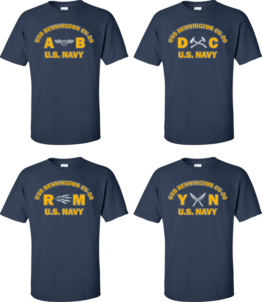 Due to disruptions in supply chains, this design will be embroidered on a Champion, Gildan, Jerzees or comparable brand.Proudly display your ship and rate with our top quality USS BENNINGTON CV-20 Rates t-shirts, sweatshirts, and hoodies. These fine U.S. Navy apparel items will make you the envy of your veteran buddies, or will make a fine gift! Our USS BENNINGTON CV-20 shirts are proudly printed in the USA!