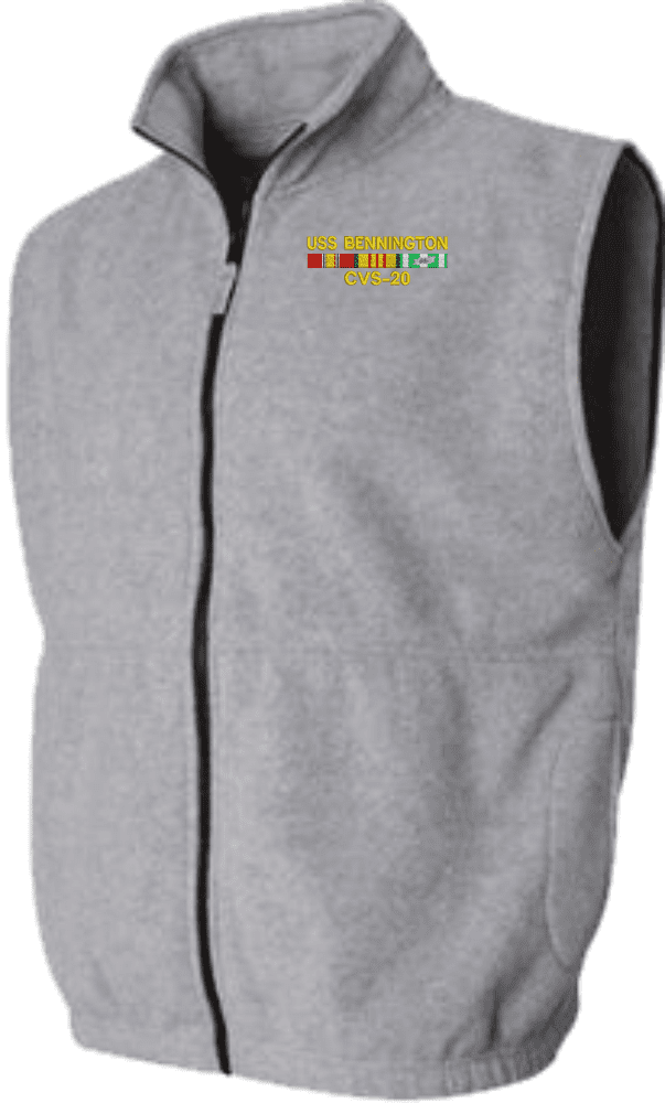 Due to supply chain disruptions, some colors and sizes may not be available in the same Brand, in these cases a brand of comparable quality will be used. Feel free to call in advance of your order, with questions you may have.MilitaryBest is proud to offer this quality USS Bennington CVS-20 with Vietnam Service Ribbons Fleece Vest. This Fleece Vest features a convertible collar with dyed-to-match zipper pull, oversized nylon reinforced slash pockets, and an elastic hem. It is made using a 100% anti-pill polyester Fleece Vest. This Fleece Vest will make an excellent addition to your wardrobe, or a quality gift. Your satisfaction is guaranteed! These Vests are custom embroidered at our facilities in Scottsboro, AL.
