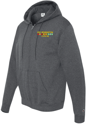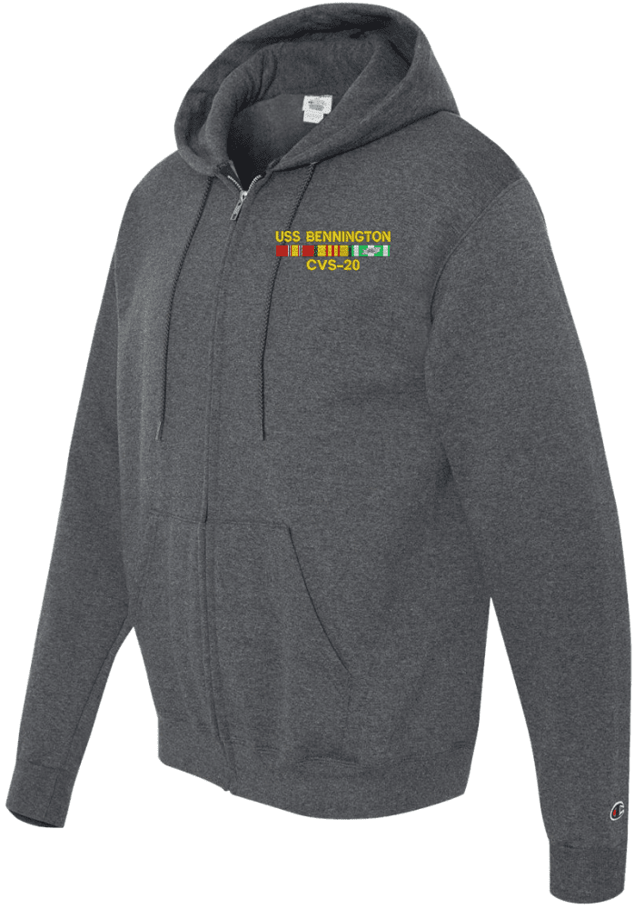 MilitaryBest has expanded its line of apparel with this custom embroidered USS Bennington CVS-20 with Vietnam Service Ribbons Zippered Hoodie. Each Hoodie is direct embroidered onto a Champion brand 9.5 oz 50/50 Cotton Poly blend. This will make an excellent addition to your wardrobe, or a great gift. Your satisfaction is Guaranteed! This is custom embroidered at our facilities in Scottsboro, AL.