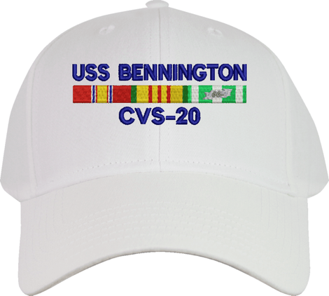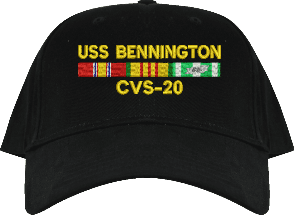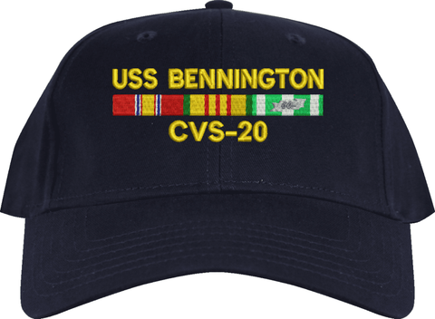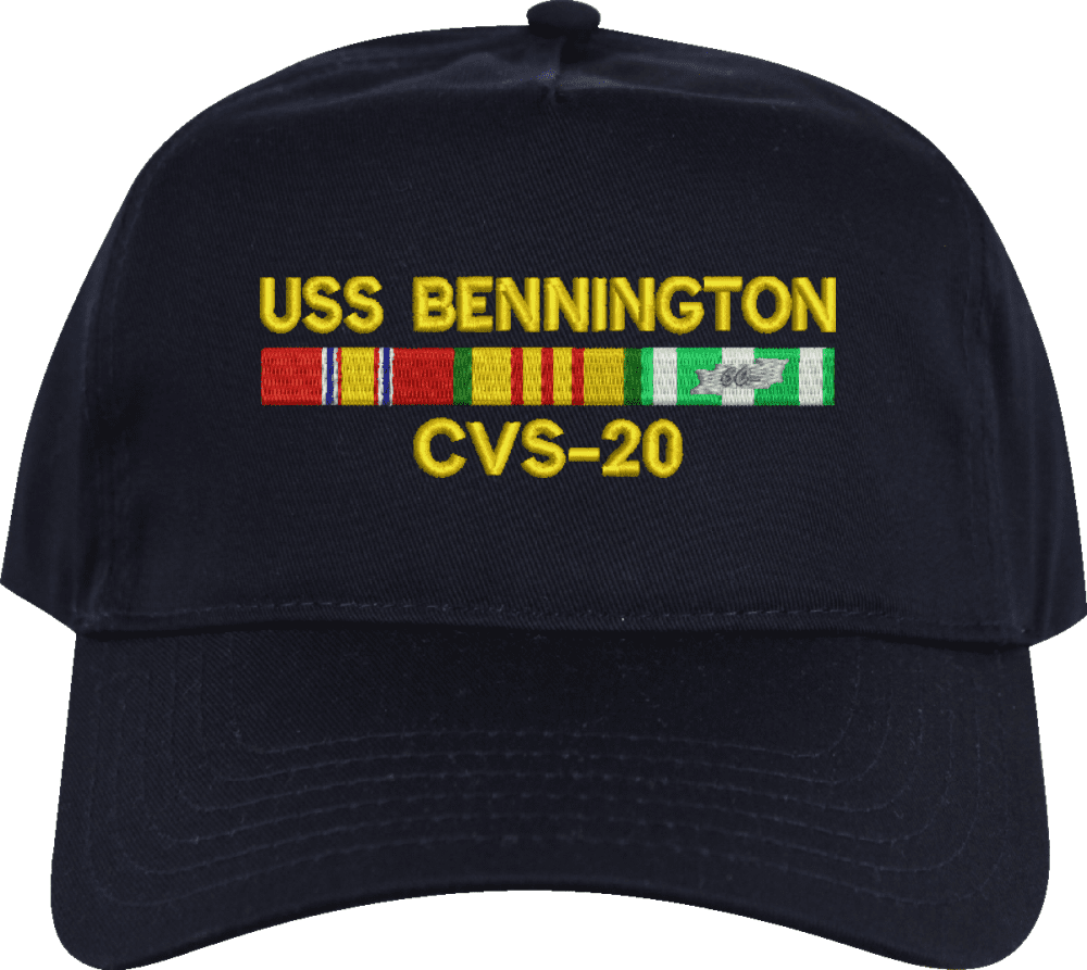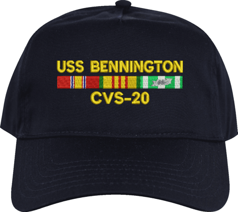 MilitaryBest is proud to offer this USS Bennington CVS-20 with Vietnam Service Ribbons Embroidered Cap. This cap is available in a 5 panel high profile or 6 panel low profile styling. All our caps are made from top quality materials. This cap would make a wonderful addition to your collection or a great gift! All custom embroidery is done at our facility in Scottsboro, AL. *Caps ordered with embroidered back text requires an additional 1 to 2 days of production time. All personalized caps will be embroidered in ALL CAPITAL LETTERS. Caps personalized with back text are not returnable unless there is a material defect in the cap.A percentage of the sale of each MilitaryBest item is forwarded to the licensing departments of each respective branch of service in support of the MWR (Morale, Welfare, & Recreation) program. These payments are made by either ALL4U LLC or the wholesaler from where the item originated. Our team thanks you for your service and your support of these programs.
