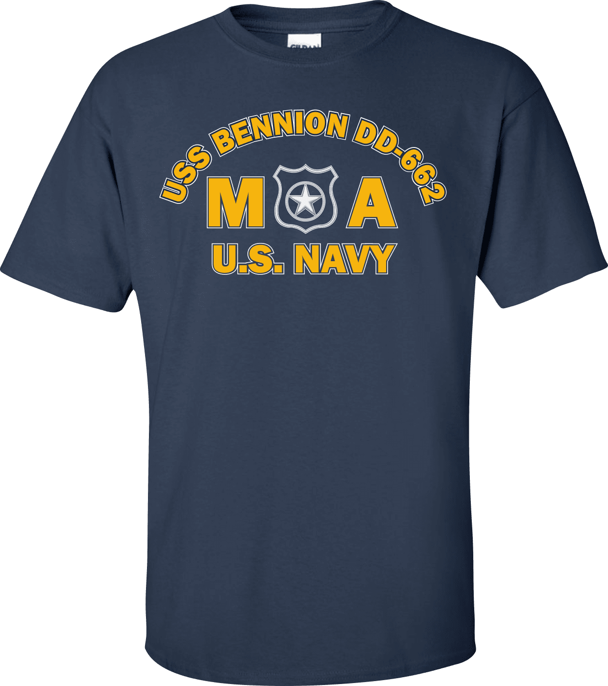 MilitaryBest is proud to offer this USS BENNION DD-662 Rate MA Master At Arms T-Shirt. This shirt is available as a 100% cotton t-shirt or a 100% polyester men’s or women’s moisture wicking t-shirt. Each shirt is proudly printed in the USA.