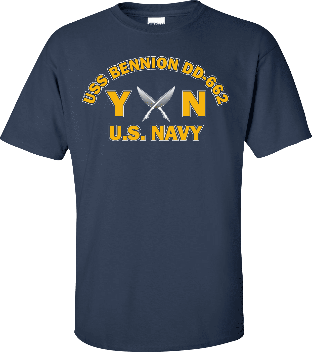 MilitaryBest is proud to offer this USS BENNION DD-662 Rate YN Yeoman T-Shirt. This shirt is available as a 100% cotton t-shirt or a 100% polyester men’s or women’s moisture wicking t-shirt. Each shirt is proudly printed in the USA.