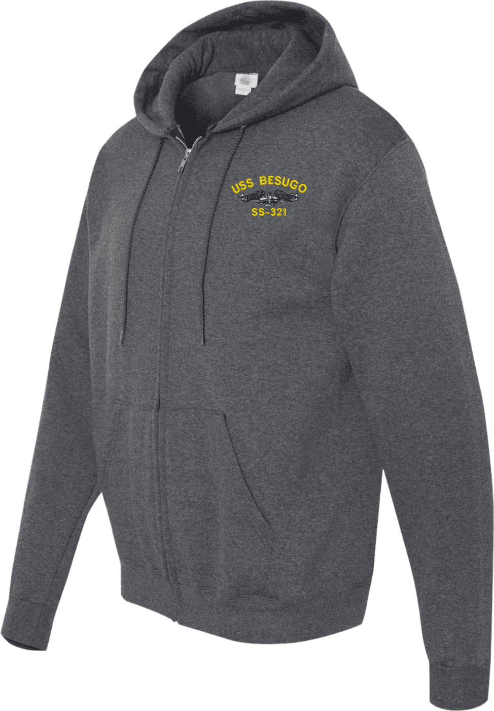 MilitaryBest has expanded its line of apparel with this custom embroidered USS Besugo SS-321 with Dolphins Embroidered Zippered Hoodie. Each Hoodie is direct embroidered onto a Champion brand 9.5 oz 50/50 Cotton Poly blend. This will make an excellent addition to your wardrobe, or a great gift. Your satisfaction is Guaranteed! These quality zippered hoodies are proudly embroidered at our facilities in Scottsboro, AL. Support the Army MWR program by purchasing only from Licensed Vendors.