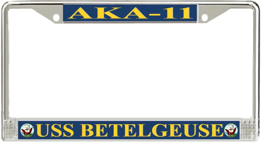 USS Betelgeuse AKA-11 License Plate FrameThis USS Betelgeuse AKA-11 License Plate Frame is proudly made in the USA at our facilities in Scottsboro, Alabama. Each of our MilitaryBest U.S. Navy Frames feature top and bottom Poly Coated Aluminum strips that are printed using sublimation which gives these quality automobile military frames a beautiful high gloss finish.