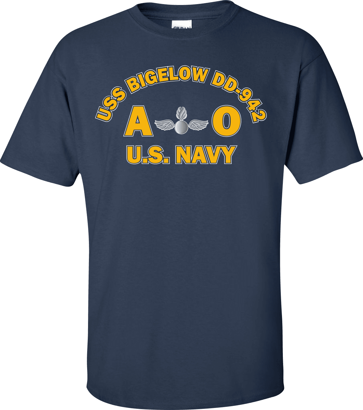 MilitaryBest is proud to offer this USS BIGELOW DD-942 Rate AO Aviation Ordnanceman T-Shirt. This shirt is available as a 100% cotton t-shirt or a 100% polyester men’s or women’s moisture wicking t-shirt. Each shirt is proudly printed in the USA.