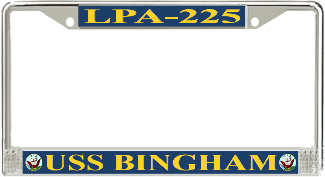 USS Bingham LPA-225 License Plate frameThis USS Bingham LPA-225 License Plate frame is proudly made in the USA at our facilities in Scottsboro, Alabama. Each of our MilitaryBest U.S. Navy Frames feature top and bottom Poly Coated Aluminum strips that are printed using sublimation which gives these quality automobile military frames a beautiful high gloss finish.