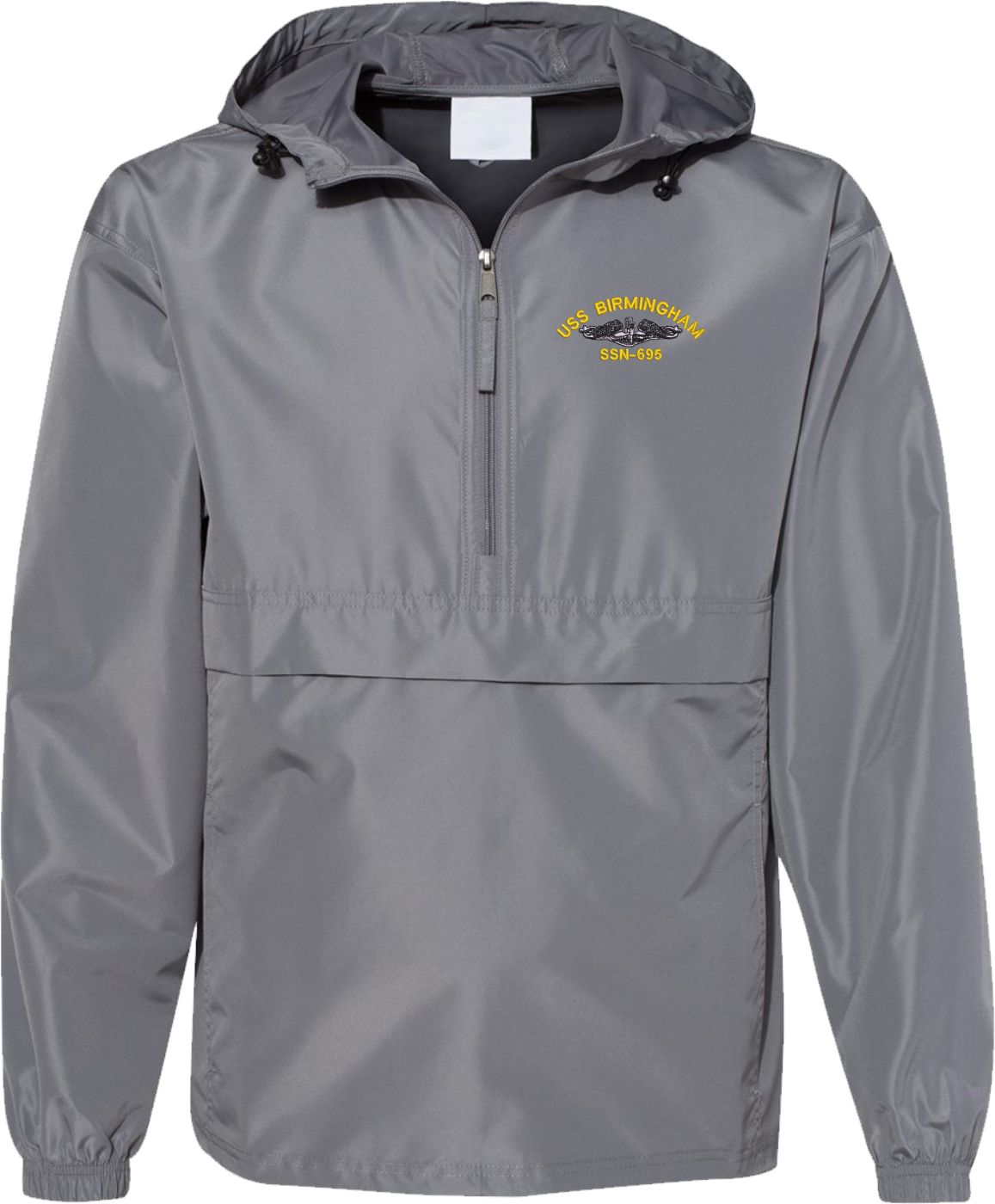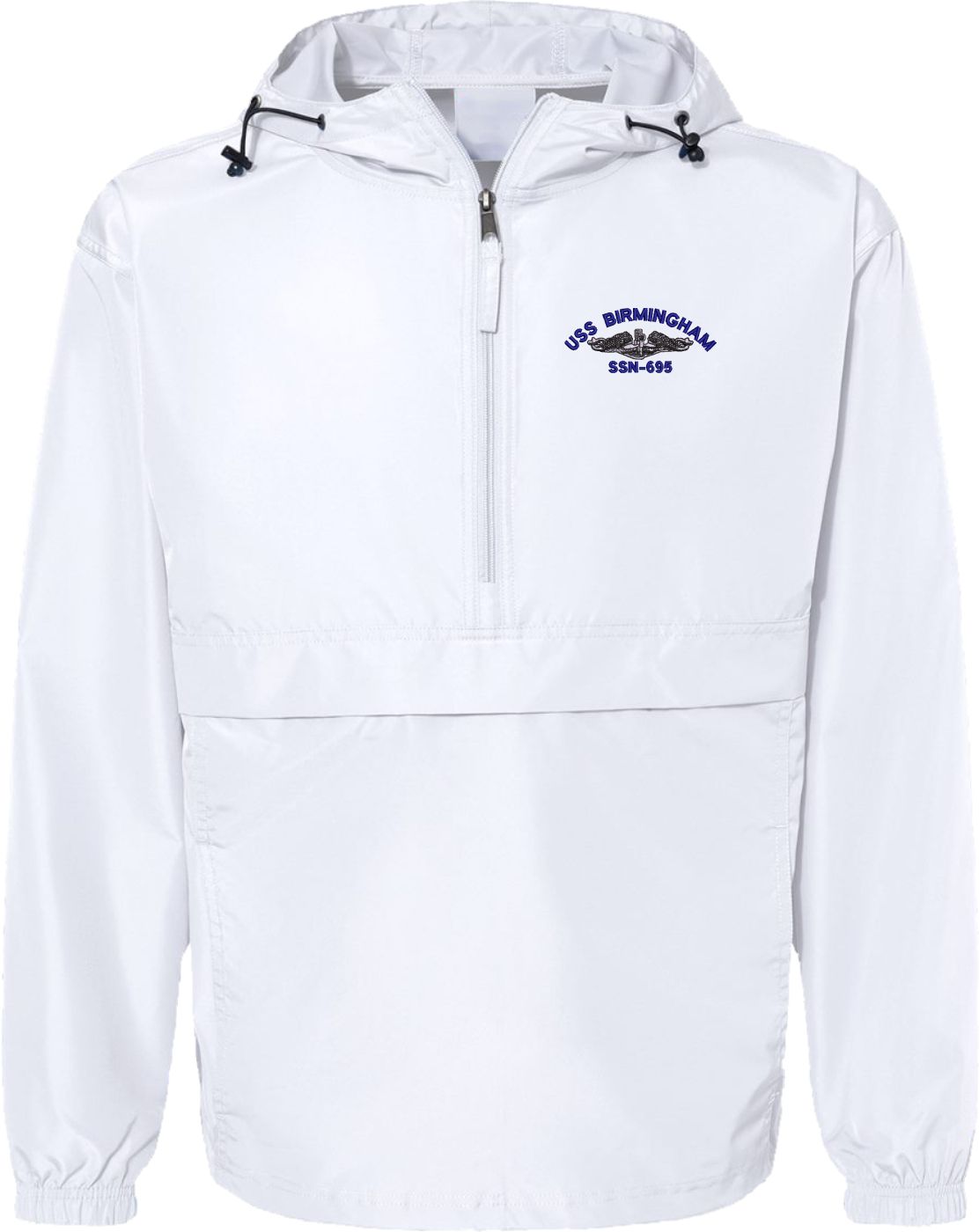 MilitaryBest is proud to offer this quality USS Birmingham SSN-695 with Dolphins Hooded Windbreaker. Also known as an Anorak Jacket, this windbreaker is designed to keep wind and water out. With a design embroidered over the left chest, this windbreaker is embroidered to order at our facilities in Scottsboro, AL.. This windbreaker can be packed into the mesh lined pouch pocket for a more portable method of storage.- 100% Polyester