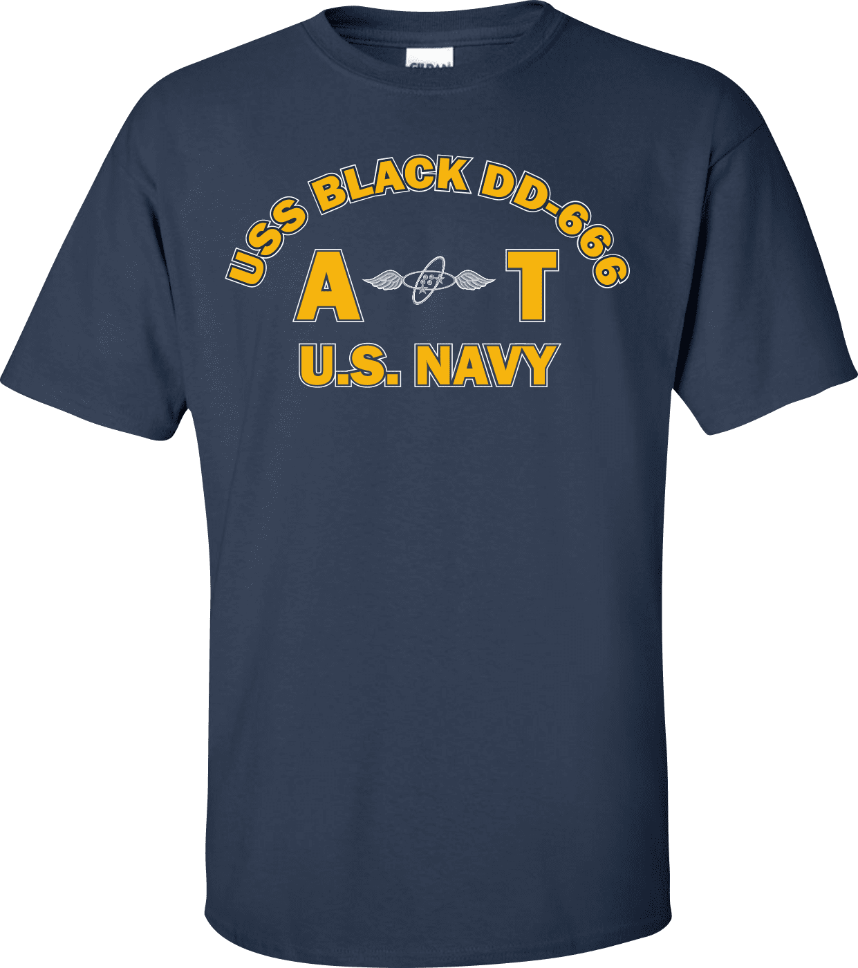 MilitaryBest is proud to offer this USS BLACK DD-666 Rate AT Aviation Electronics Technician T-Shirt. This shirt is available as a 100% cotton t-shirt or a 100% polyester men’s or women’s moisture wicking t-shirt. Each shirt is proudly printed in the USA.