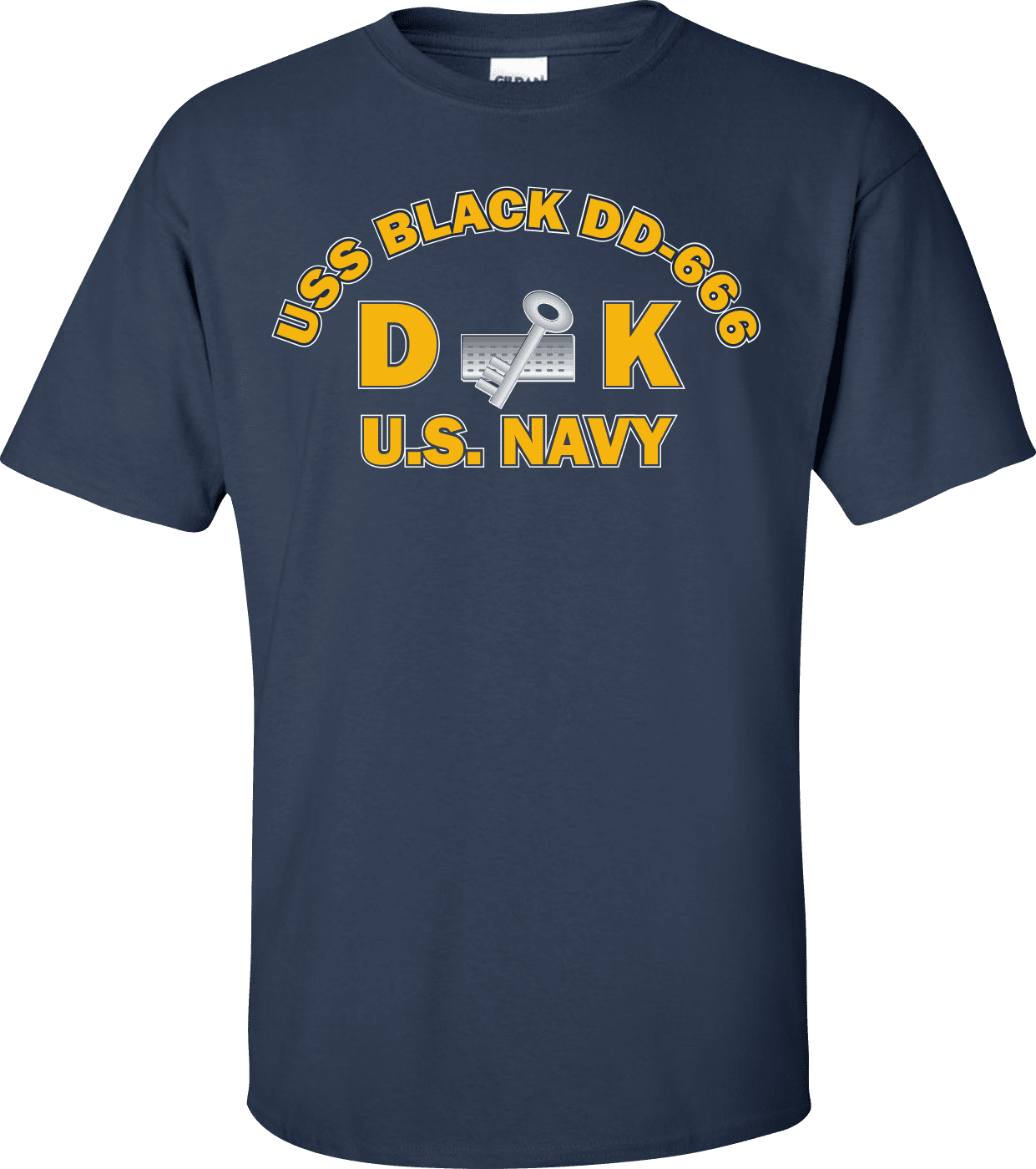 MilitaryBest is proud to offer this USS BLACK DD-666 Rate DK Disbursing Clerk T-Shirt. This shirt is available as a 100% cotton t-shirt or a 100% polyester men’s or women’s moisture wicking t-shirt. Each shirt is proudly printed in the USA.