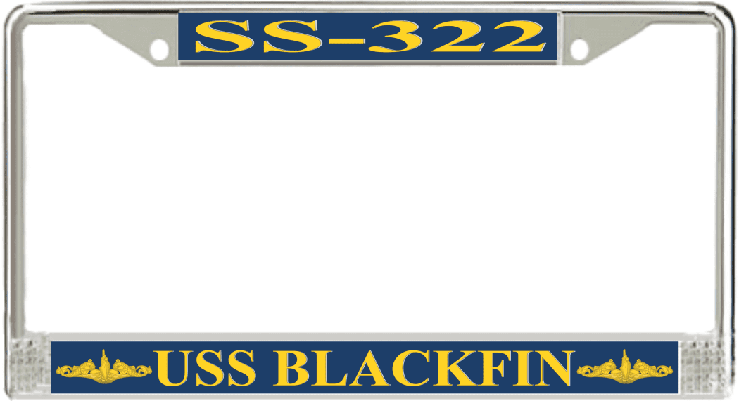 USS Blackfin SS-322 License Plate Frame This USS Blackfin SS-322 License Plate Frame is proudly made in the USA at our facilities in Scottsboro, Alabama. Each Frame features top and bottom sublimated design strips that are poly coated for a protective gloss finish. Please check your state and local regulations for compatibility of these frames for use on your vehicle.