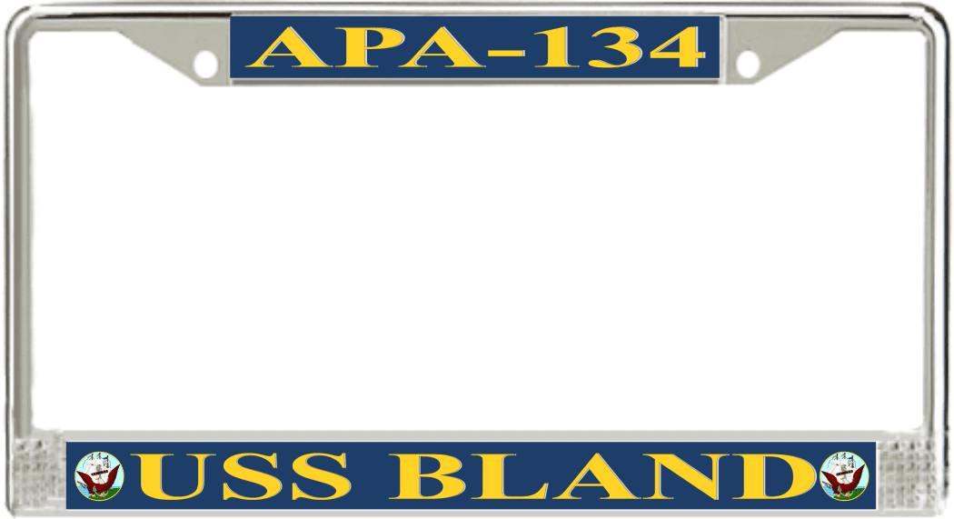 USS Bland APA-134 License Plate FrameThis USS Bland APA-134 License Plate Frame is proudly made in the USA at our facilities in Scottsboro, Alabama. Each of our MilitaryBest U.S. Navy Frames feature top and bottom Poly Coated Aluminum strips that are printed using sublimation which gives these quality automobile military frames a beautiful high gloss finish.