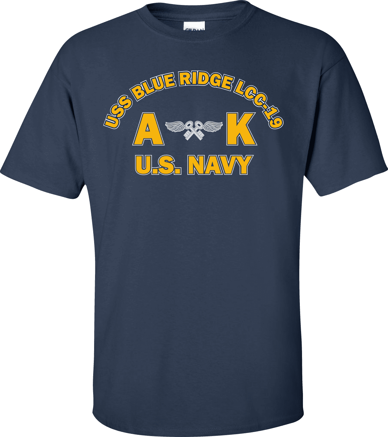 MilitaryBest is proud to offer this USS BLUE RIDGE LCC-19 Rate AK Aviation Storekeeper T-Shirt. This shirt is available as a 100% cotton t-shirt or a 100% polyester men’s or women’s moisture wicking t-shirt. Each shirt is proudly printed in the USA.