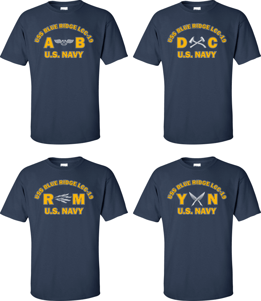Due to disruptions in supply chains, this design will be embroidered on a Champion, Gildan, Jerzees or comparable brand.Proudly display your ship and rate with our top quality USS BLUE RIDGE LCC-19 Rates t-shirts, sweatshirts, and hoodies. These fine U.S. Navy apparel items will make you the envy of your veteran buddies, or will make a fine gift! Our USS BLUE RIDGE LCC-19 shirts are proudly printed in the USA!