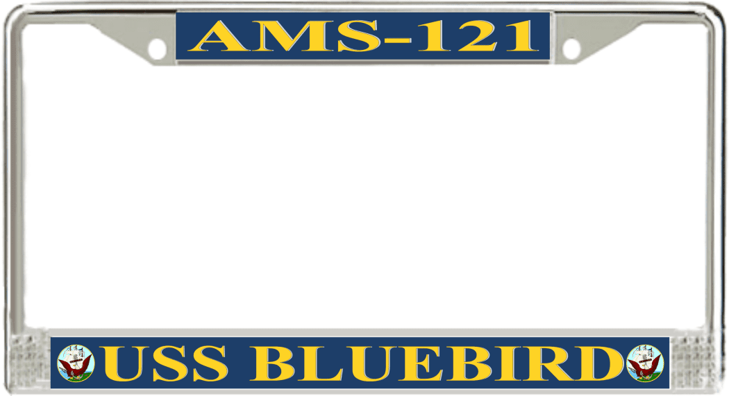 USS Bluebird AMS-121 License Plate Frame This USS Bluebird AMS-121 License Plate Frame is proudly made in the USA at our facilities in Scottsboro, Alabama. Each Frame features top and bottom sublimated design strips that are poly coated for a protective gloss finish. Please check your state and local regulations for compatibility of these frames for use on your vehicle.