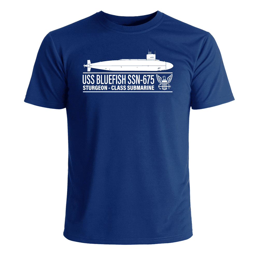 MilitaryBest is proud to offer this U.S. Navy Submarine T-Shirt. Each design is offered in Navy Blue. This fine USS Bluefish SSN-675 T-Shirt is proudly printed in the USA. The quality of all of our Military products is guaranteed. Unless there is a defect in workmanship or material, these shirts are unreturnable.A percentage of the sale of each MilitaryBest item is forwarded to the licensing departments of each respective branch of service in support of the MWR (Morale, Welfare, & Recreation) program. These payments are made by either ALL4U LLC or the wholesaler from where the item originated. Our team thanks you for your service and your support of these programs.