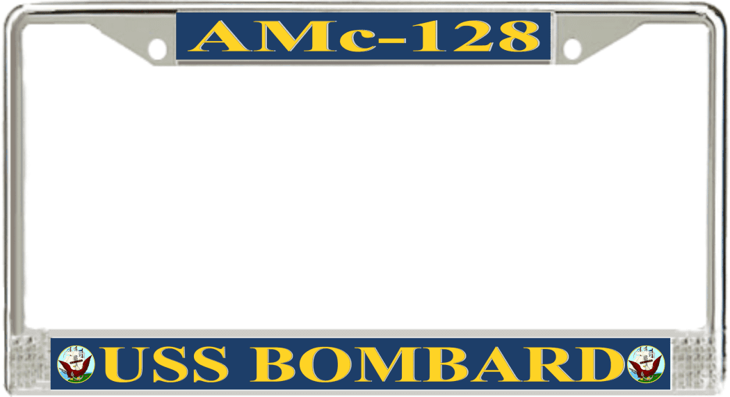 USS Bombard AMc-128 License Plate FrameThis USS Bombard AMc-128 License Plate Frame is proudly made in the USA at our facilities in Scottsboro, Alabama. Each of our MilitaryBest U.S. Navy Frames feature top and bottom Poly Coated Aluminum strips that are printed using sublimation which gives these quality automobile military frames a beautiful high gloss finish.