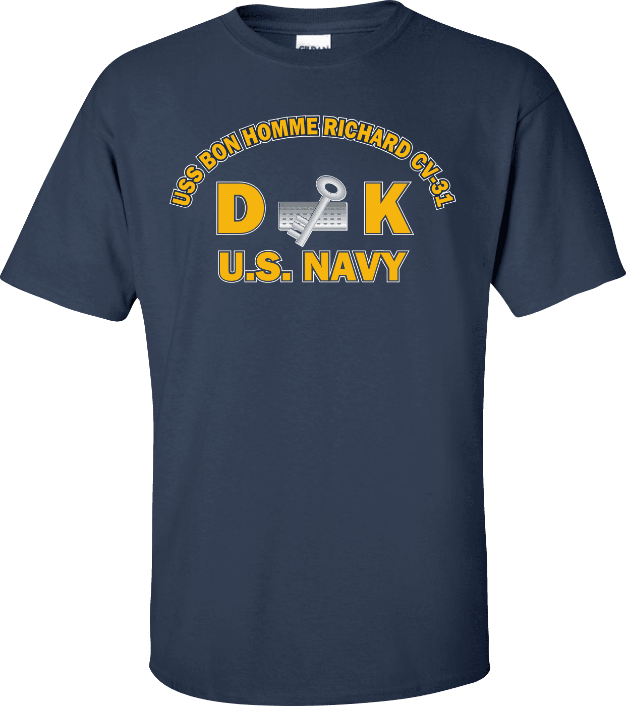 MilitaryBest is proud to offer this USS BON HOMME RICHARD CV-31 Rate DK Disbursing Clerk T-Shirt. This shirt is available as a 100% cotton t-shirt or a 100% polyester men’s or women’s moisture wicking t-shirt. Each shirt is proudly printed in the USA.