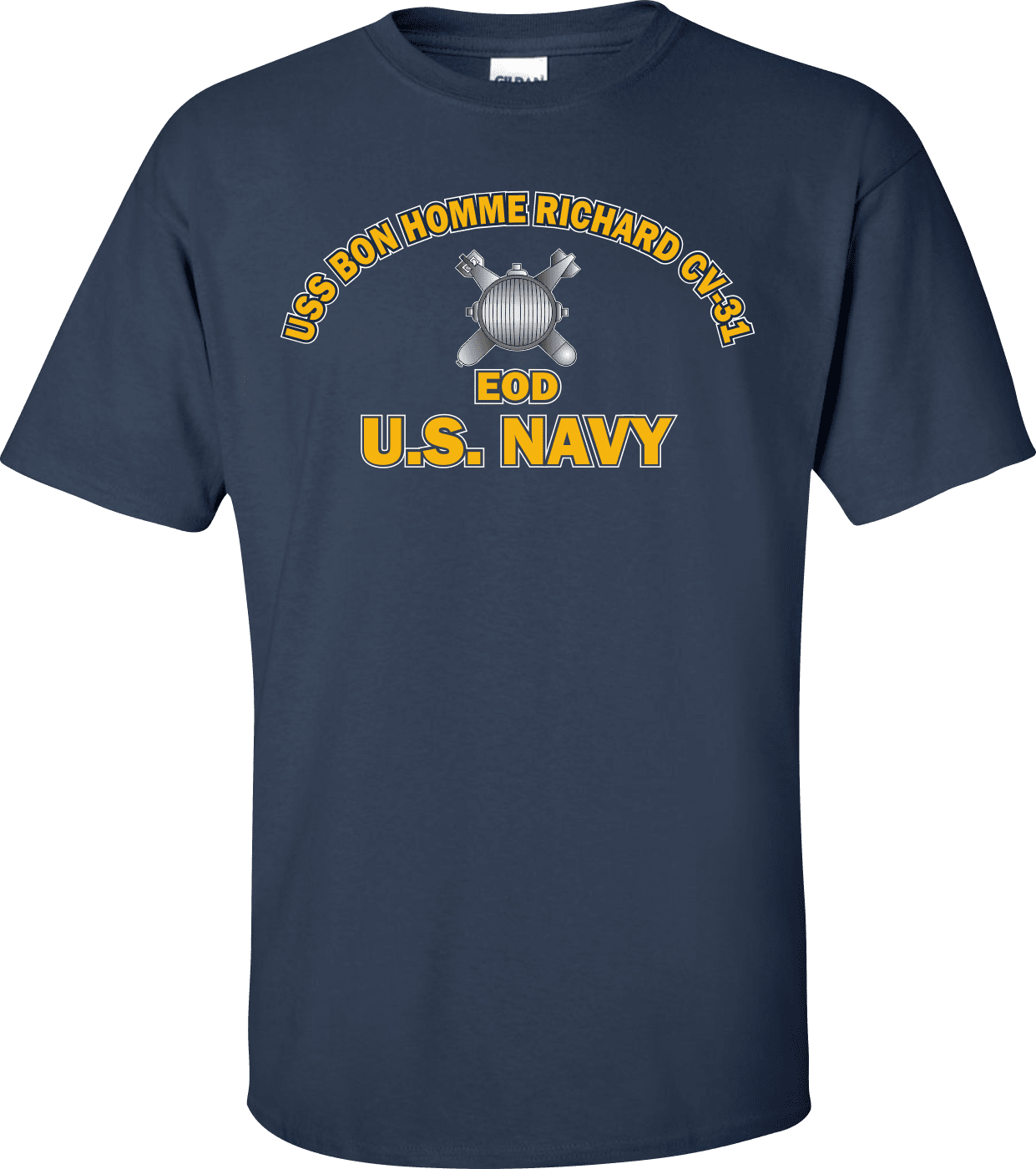 MilitaryBest is proud to offer this USS BON HOMME RICHARD CV-31 Rate EOD Explosive Ordnance Disposal T-Shirt. This shirt is available as a 100% cotton t-shirt or a 100% polyester men’s or women’s moisture wicking t-shirt. Each shirt is proudly printed in the USA.