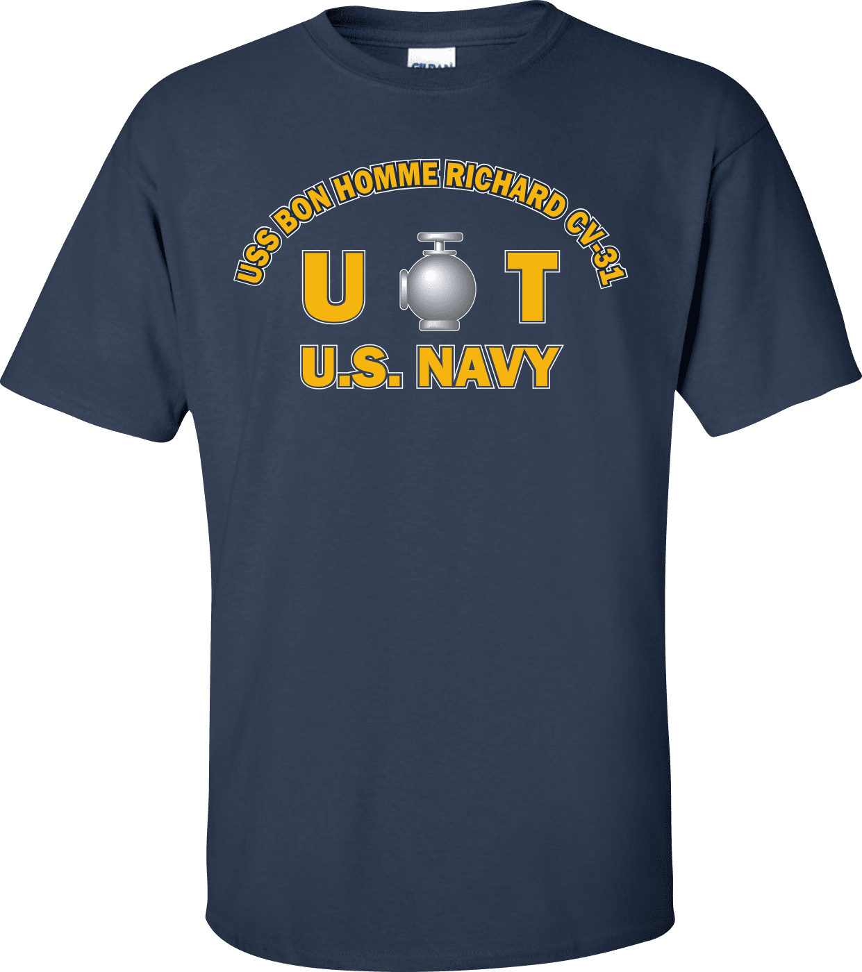 MilitaryBest is proud to offer this USS BON HOMME RICHARD CV-31 Rate UT Utilitiesman T-Shirt. This shirt is available as a 100% cotton t-shirt or a 100% polyester men’s or women’s moisture wicking t-shirt. Each shirt is proudly printed in the USA.