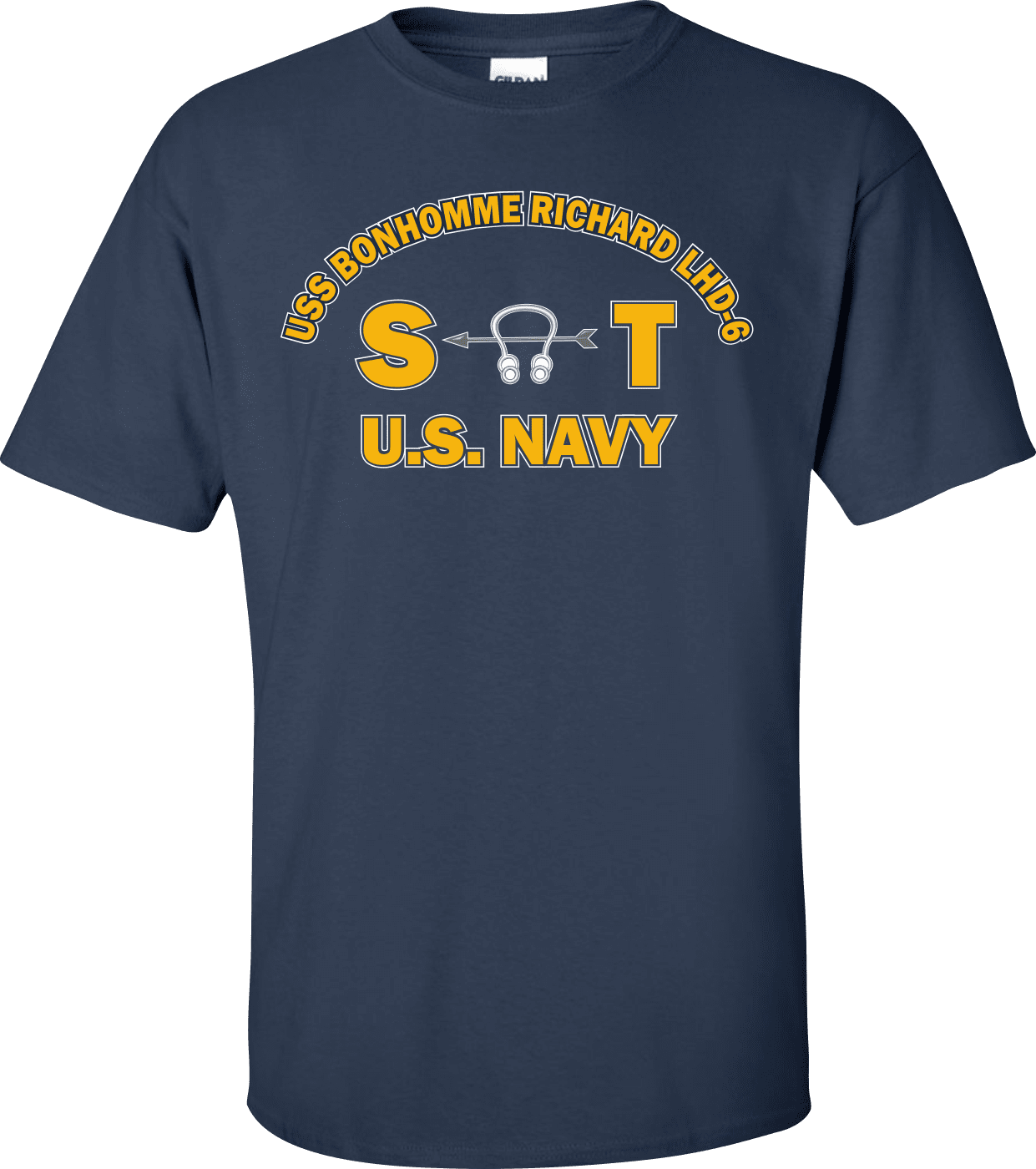MilitaryBest is proud to offer this USS BONHOMME RICHARD LHD-6 Rate ST Sonar Technician T-Shirt. This shirt is available as a 100% cotton t-shirt or a 100% polyester men’s or women’s moisture wicking t-shirt. Each shirt is proudly printed in the USA.
