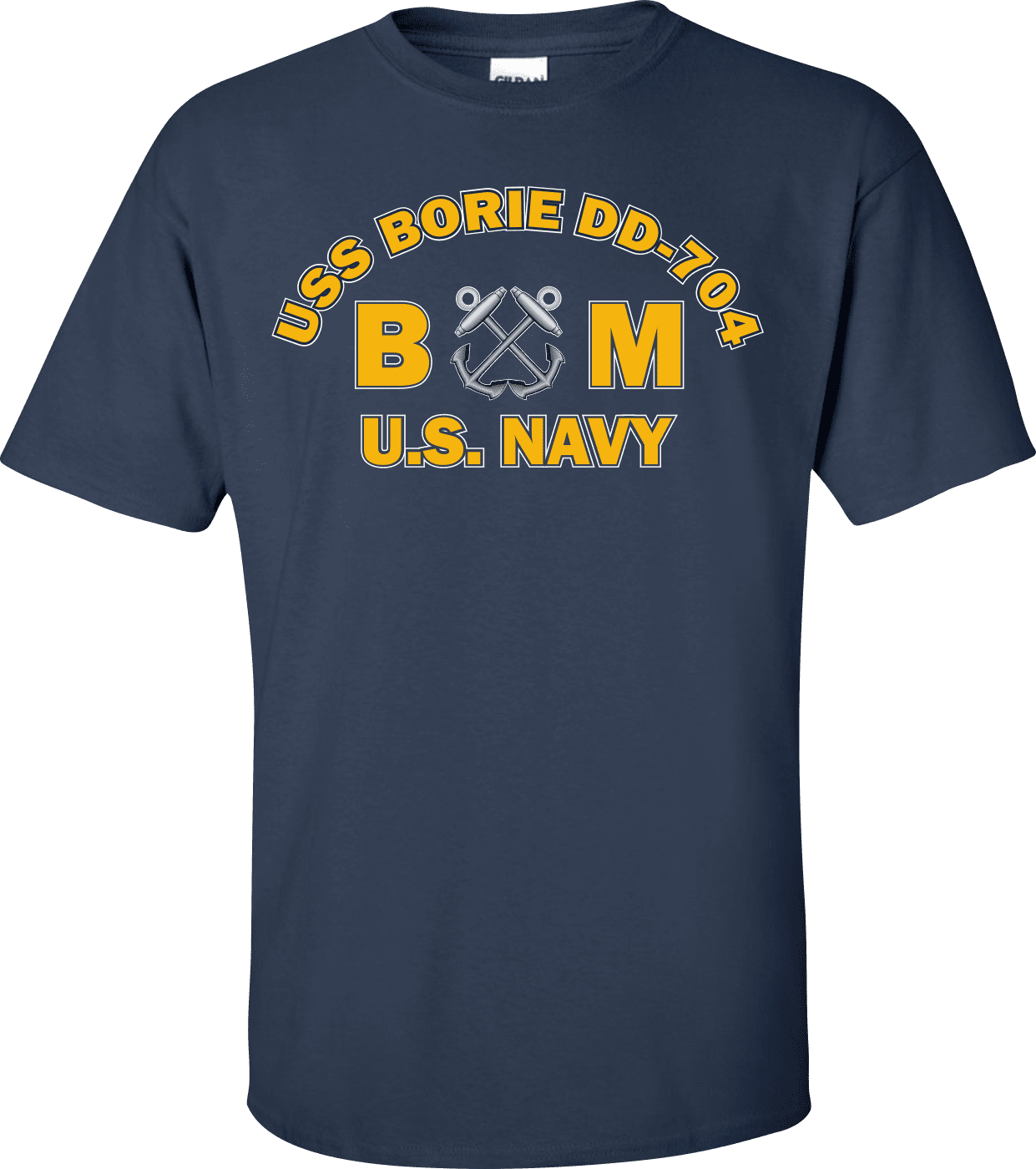 MilitaryBest is proud to offer this USS BORIE DD-704 Rate BM Boatswains Mate T-Shirt. This shirt is available as a 100% cotton t-shirt or a 100% polyester men’s or women’s moisture wicking t-shirt. Each shirt is proudly printed in the USA.