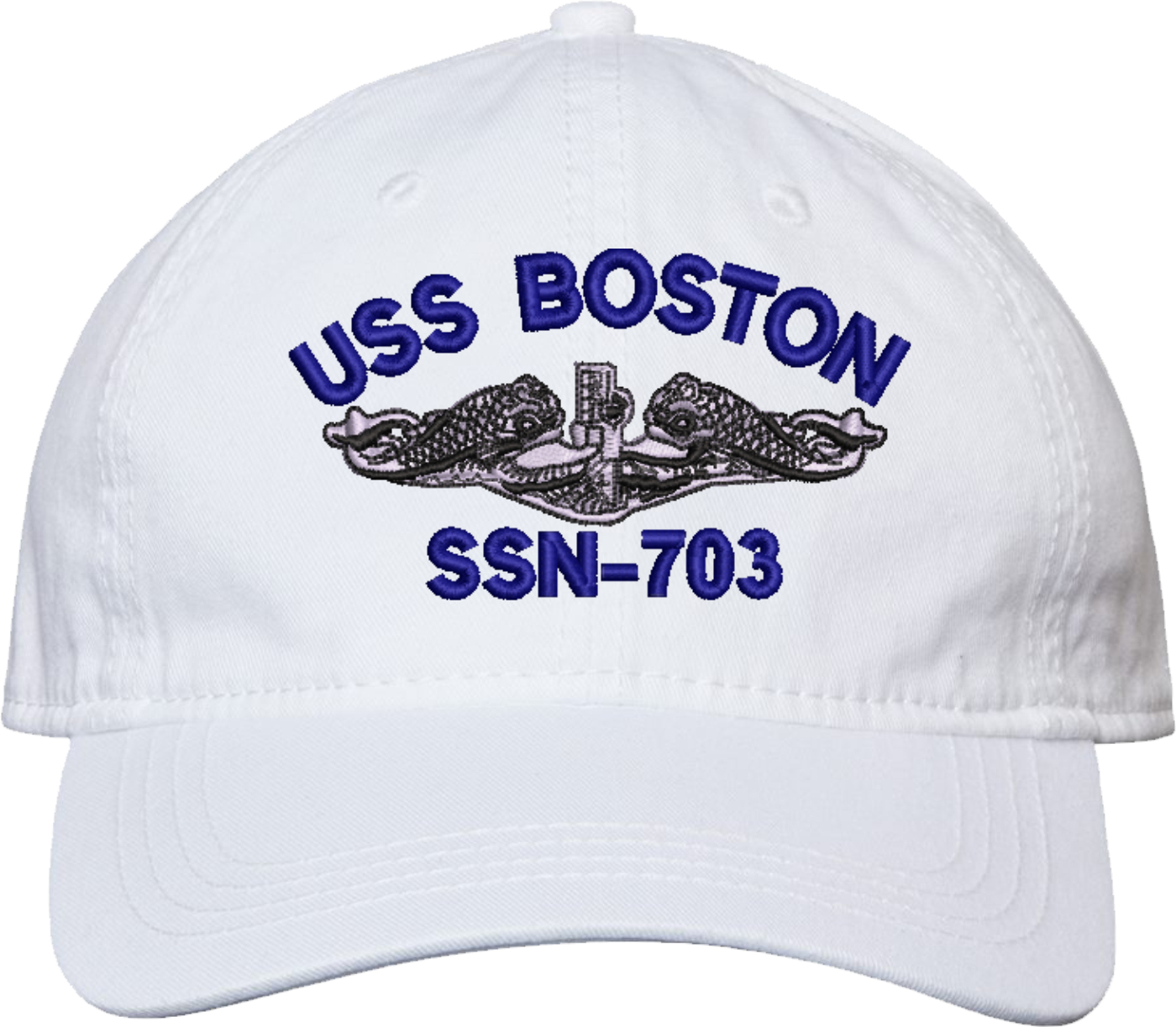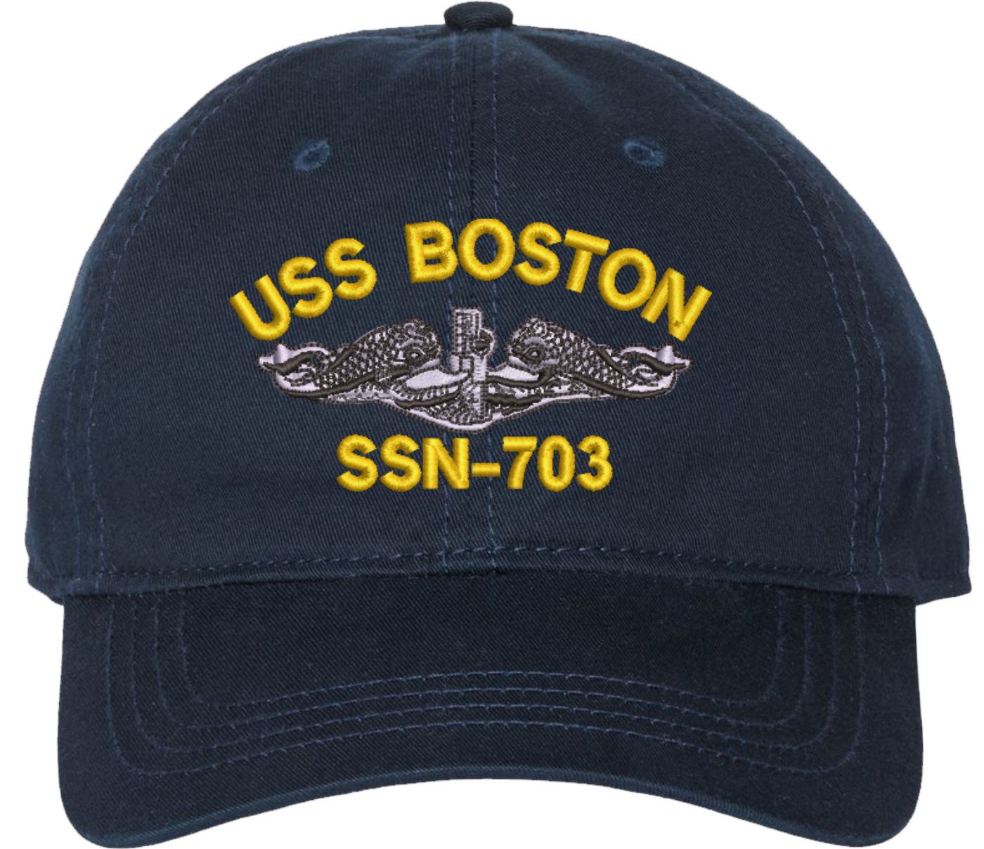 Show your Navy pride with this USS Boston SSN-703 with Dolphins Unstructured Dad Cap from MilitaryBest. Crafted from 100% washed chino twill cotton, this six-panel, low-profile cap offers a relaxed and comfortable fit. Featuring high-quality embroidery done in our Scottsboro, Alabama facility, this cap is designed with a pre-curved visor and an adjustable tri-glide buckle closure for a perfect fit. Whether for everyday wear or as a meaningful gift, this cap is a great way to honor your own or a loved one's service.For caps ordered with custom embroidered personalized text please allow an additional 3 to 5 days production time. All custom back text will be embroidered in ALL CAPITAL LETTERS. Caps with back text or eggs are non-returnable unless there is a material defect in the cap.