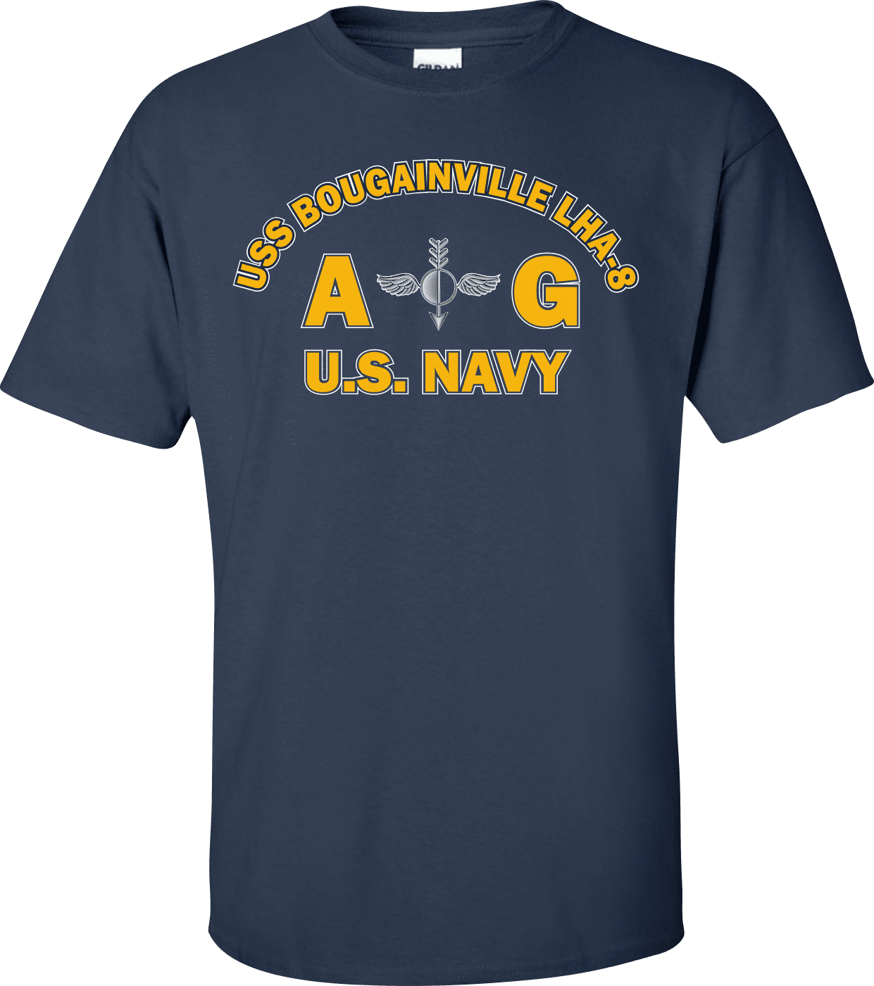 MilitaryBest is proud to offer this USS BOUGAINVILLE LHA-8 Rate AG Aerographers Mate T-Shirt. This shirt is available as a 100% cotton t-shirt or a 100% polyester men’s or women’s moisture wicking t-shirt. Each shirt is proudly printed in the USA.