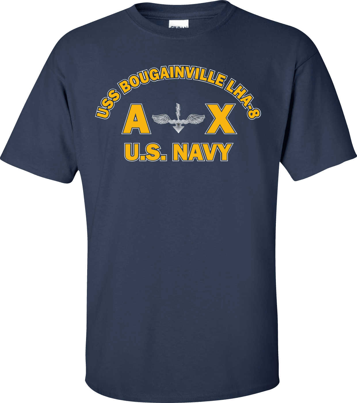 MilitaryBest is proud to offer this USS BOUGAINVILLE LHA-8 Rate AX Antisubmarine Warfare Technician T-Shirt. This shirt is available as a 100% cotton t-shirt or a 100% polyester men’s or women’s moisture wicking t-shirt. Each shirt is proudly printed in the USA.