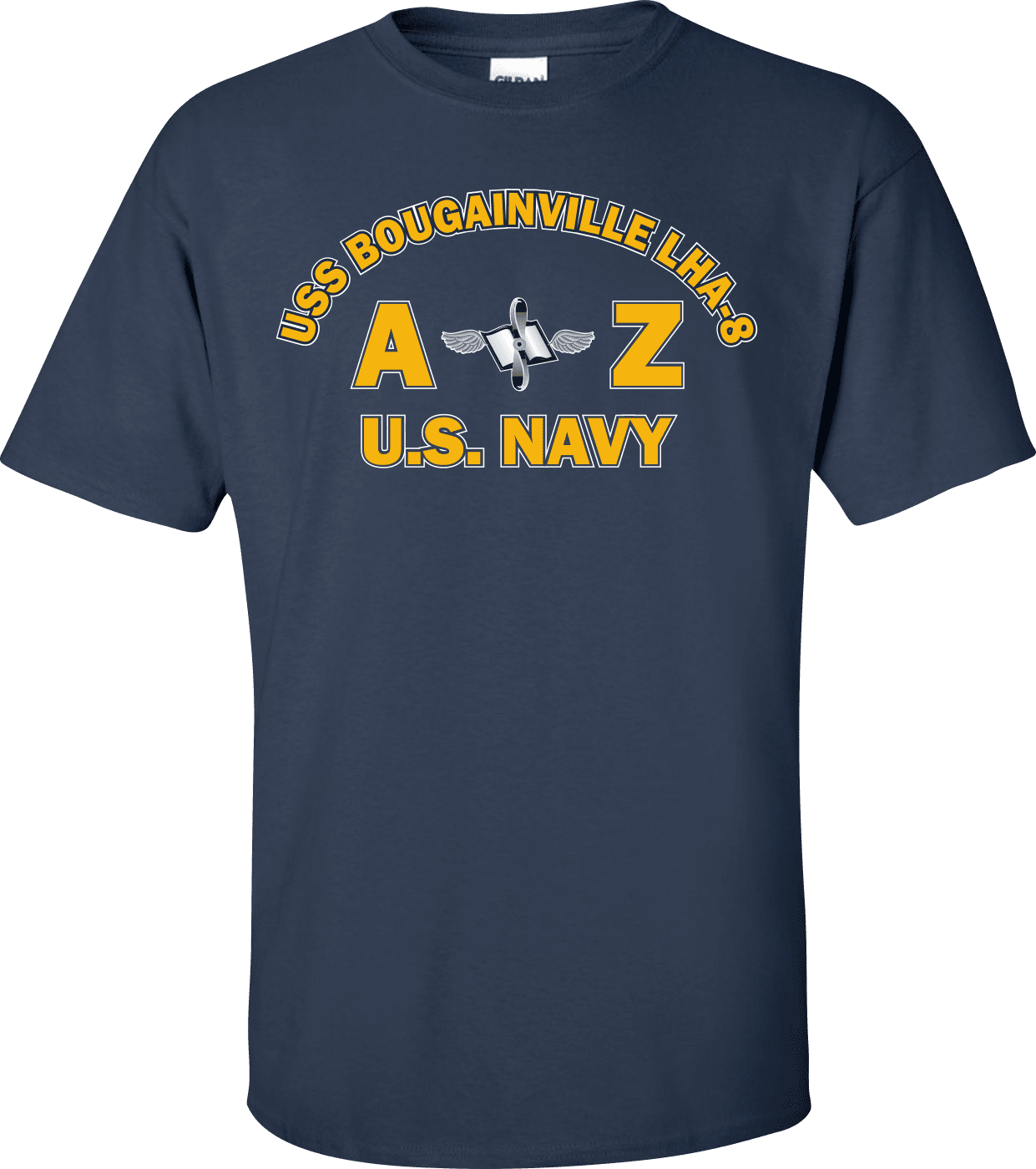 MilitaryBest is proud to offer this USS BOUGAINVILLE LHA-8 Rate AZ Aviation Maintenance Administrationman T-Shirt. This shirt is available as a 100% cotton t-shirt or a 100% polyester men’s or women’s moisture wicking t-shirt. Each shirt is proudly printed in the USA.