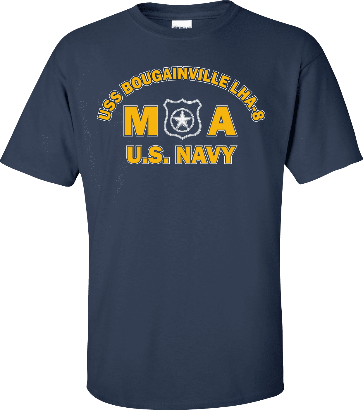 MilitaryBest is proud to offer this USS BOUGAINVILLE LHA-8 Rate MA Master At Arms T-Shirt. This shirt is available as a 100% cotton t-shirt or a 100% polyester men’s or women’s moisture wicking t-shirt. Each shirt is proudly printed in the USA.