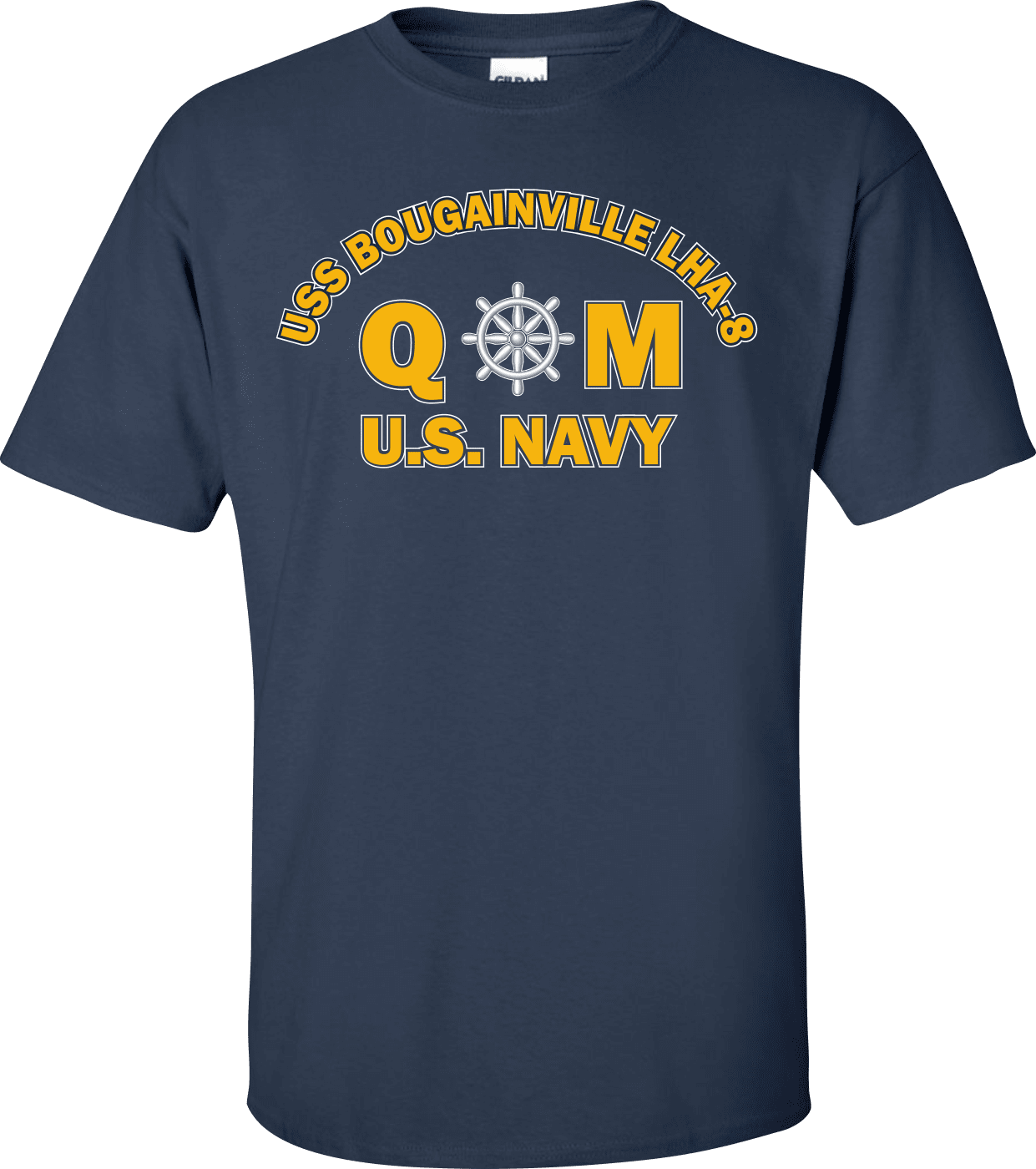 MilitaryBest is proud to offer this USS BOUGAINVILLE LHA-8 Rate QM Quartermaster T-Shirt. This shirt is available as a 100% cotton t-shirt or a 100% polyester men’s or women’s moisture wicking t-shirt. Each shirt is proudly printed in the USA.
