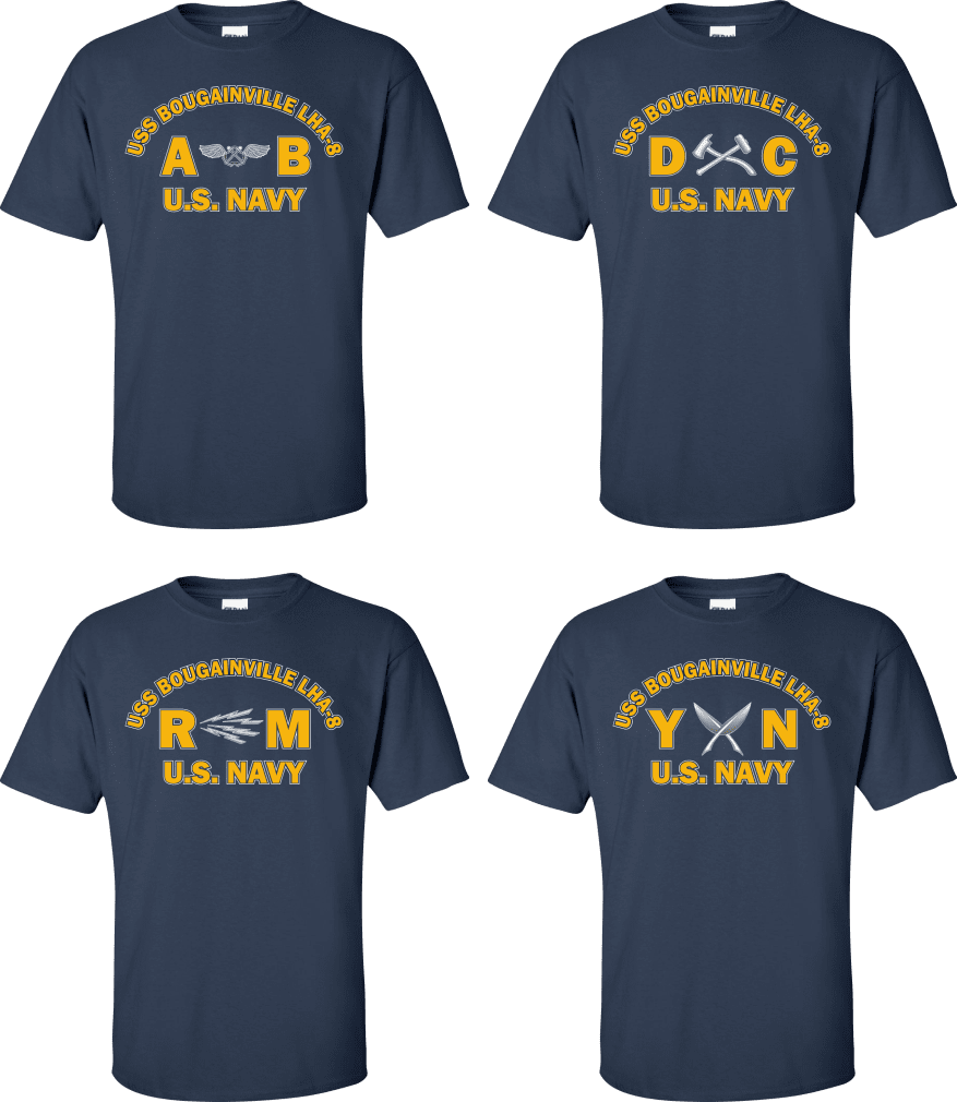 Due to disruptions in supply chains, this design will be embroidered on a Champion, Gildan, Jerzees or comparable brand.Proudly display your ship and rate with our top quality USS BOUGAINVILLE LHA-8 Rates t-shirts, sweatshirts, and hoodies. These fine U.S. Navy apparel items will make you the envy of your veteran buddies, or will make a fine gift! Our USS BOUGAINVILLE LHA-8 shirts are proudly printed in the USA!