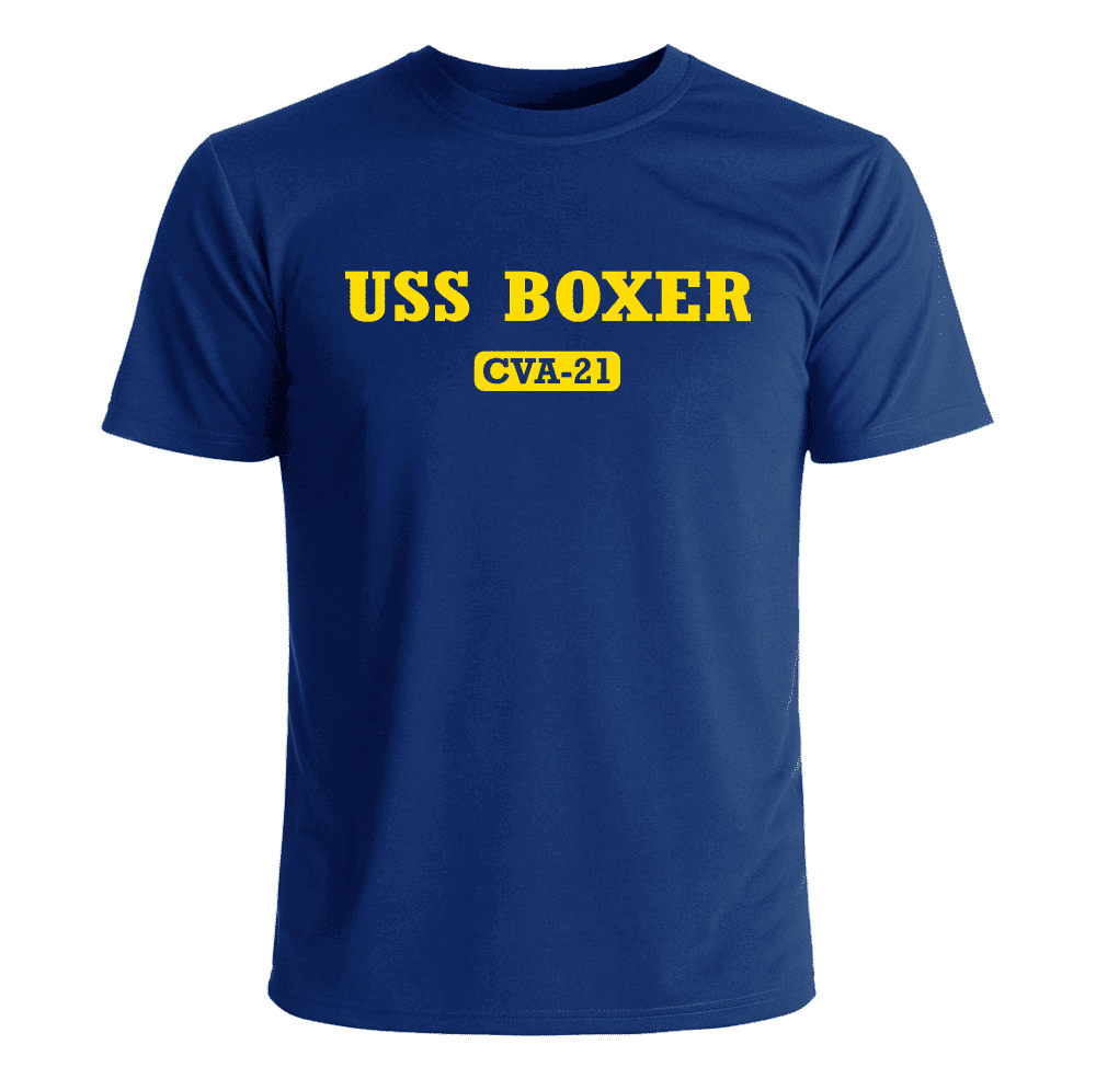 Please enjoy this US Navy officially licensed USS Boxer CVA-21 T-Shirt. It is a 100% cotton shirt and is available in S, M, L, XL, 2X, 3X and 4X sizes.A percentage of the sale of each MilitaryBest item is forwarded to the licensing departments of each respective branch of service in support of the MWR (Morale, Welfare, & Recreation) program. These payments are made by either ALL4U LLC or the wholesaler from where the item originated. Our team thanks you for your service and your support of these programs.