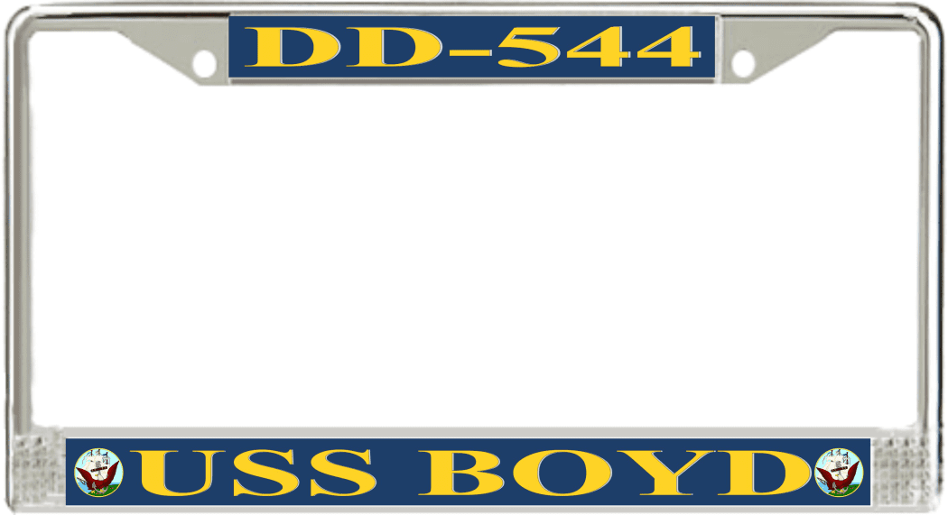 USS Boyd DD-544 License Plate FrameThis USS Boyd DD-544 License Plate Frame is proudly made in the USA at our facilities in Scottsboro, Alabama. Each of our MilitaryBest U.S. Navy Frames feature top and bottom Poly Coated Aluminum strips that are printed using sublimation which gives these quality automobile military frames a beautiful high gloss finish.