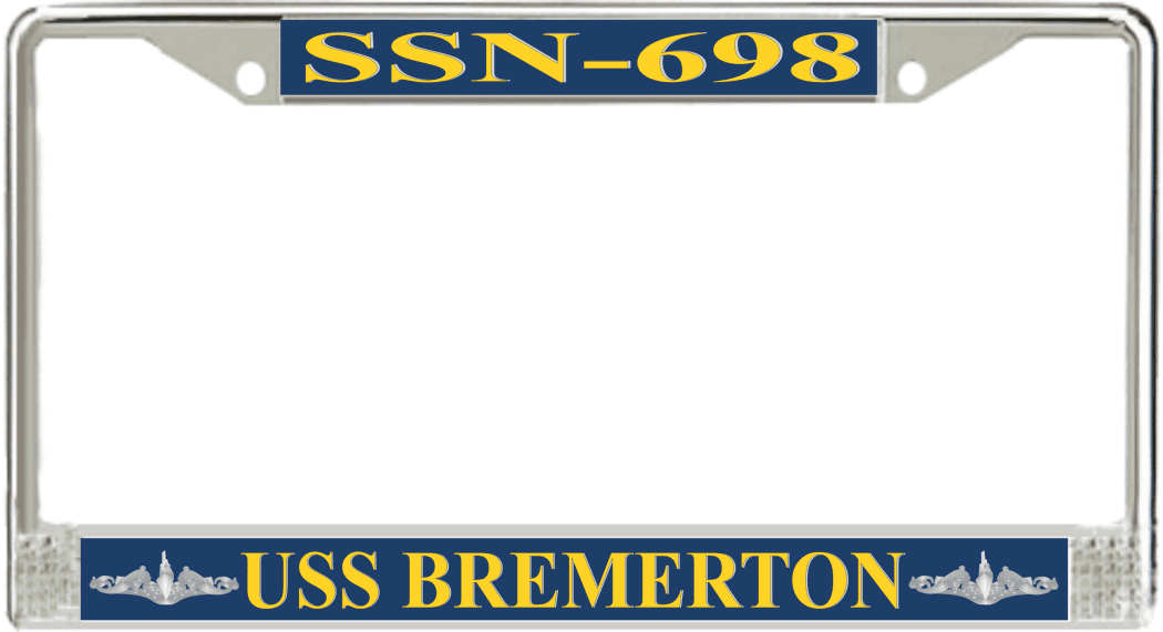 USS Bremerton SSN-698 License Plate Frame This USS Bremerton SSN-698 License Plate Frame is proudly made in the USA at our facilities in Scottsboro, Alabama. Each Frame features top and bottom sublimated design strips that are poly coated for a protective gloss finish. Please check your state and local regulations for compatibility of these frames for use on your vehicle.