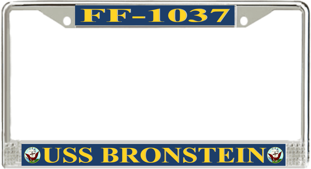 USS Bronstein FF-1037 License Plate FrameThis USS Bronstein FF-1037 License Plate Frame is proudly made in the USA at our facilities in Scottsboro, Alabama. Each of our MilitaryBest U.S. Navy Frames feature top and bottom Poly Coated Aluminum strips that are printed using sublimation which gives these quality automobile military frames a beautiful high gloss finish.