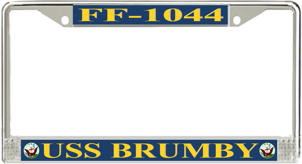 USS Brumby FF-1044 License Plate FrameThis USS Brumby FF-1044 License Plate Frame is proudly made in the USA at our facilities in Scottsboro, Alabama. Each of our MilitaryBest U.S. Navy Frames feature top and bottom Poly Coated Aluminum strips that are printed using sublimation which gives these quality automobile military frames a beautiful high gloss finish.