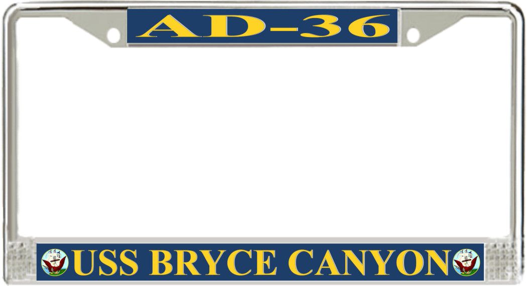 USS Bryce Canyon AD-36 License Plate FrameThis USS Bryce Canyon AD-36 License Plate Frame is proudly made in the USA at our facilities in Scottsboro, Alabama. Each of our MilitaryBest U.S. Navy Frames feature top and bottom Poly Coated Aluminum strips that are printed using sublimation which gives these quality automobile military frames a beautiful high gloss finish.