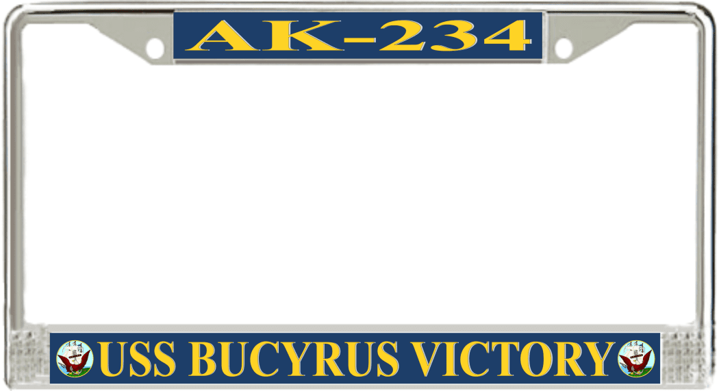 USS Bucyrus Victory AK-234 License Plate FrameThis USS Bucyrus Victory AK-234 License Plate Frame is proudly made in the USA at our facilities in Scottsboro, Alabama. Each of our MilitaryBest U.S. Navy Frames feature top and bottom Poly Coated Aluminum strips that are printed using sublimation which gives these quality automobile military frames a beautiful high gloss finish.