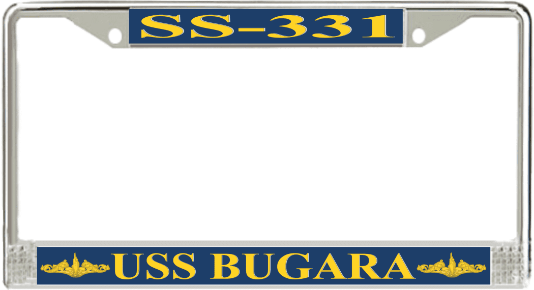 USS Bugara SS-331 License Plate Frame This USS Bugara SS-331 License Plate Frame is proudly made in the USA at our facilities in Scottsboro, Alabama. Each Frame features top and bottom sublimated design strips that are poly coated for a protective gloss finish. Please check your state and local regulations for compatibility of these frames for use on your vehicle.