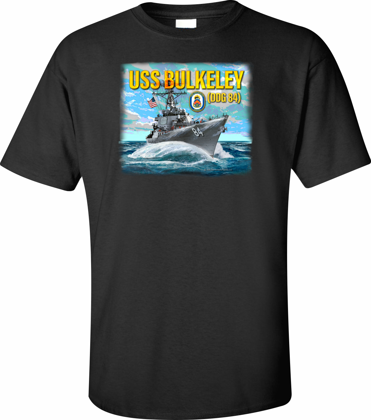 MilitaryBest is proud to offer this fine USS Bulkeley DDG-84 Printed Art T-Shirt. This shirt features a full front print, with beautiful artwork designed by licensed Navy artist David Hart. This shirt is available in black and navy blue colors. Each T-shirt is proudly printed in the USA.Unless there is a defect in workmanship or material, these shirts are unreturnable.