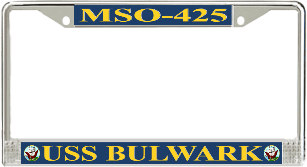 USS Bulwark MSO-425 License Plate FrameThis USS Bulwark MSO-425 License Plate Frame is proudly made in the USA at our facilities in Scottsboro, Alabama. Each of our MilitaryBest U.S. Navy Frames feature top and bottom Poly Coated Aluminum strips that are printed using sublimation which gives these quality automobile military frames a beautiful high gloss finish.