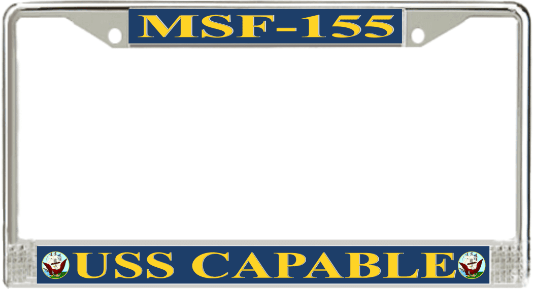 USS Capable MSF-155 License Plate FrameThis USS Capable MSF-155 License Plate Frame is proudly made in the USA at our facilities in Scottsboro, Alabama. Each of our MilitaryBest U.S. Navy Frames feature top and bottom Poly Coated Aluminum strips that are printed using sublimation which gives these quality automobile military frames a beautiful high gloss finish.