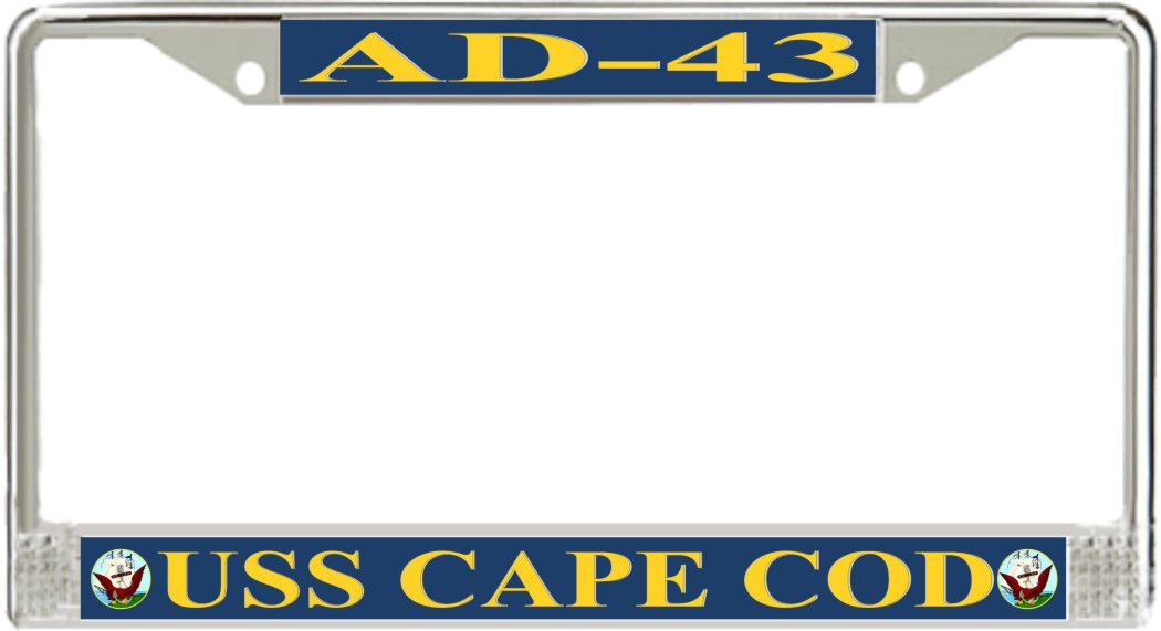 USS Cape Cod AD-43 License Plate FrameThis USS Cape Cod AD-43 License Plate Frame is proudly made in the USA at our facilities in Scottsboro, Alabama. Each of our MilitaryBest U.S. Navy Frames feature top and bottom Poly Coated Aluminum strips that are printed using sublimation which gives these quality automobile military frames a beautiful high gloss finish.